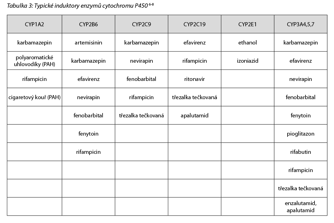 Nejčetnější jsou interakce na úrovni cytochromu P450 (CYP). Všechna léčiva mohou být substráty, induktory a inhibitory izoforem CYP. Jedno léčivo může být v určitých poměrech metabolizováno současně několika izoformami a pro každou z nich může být tato molekula nezávisle na sobě jako substrát, inhibitor nebo induktor (např. omeprazol je substrátem CYP2C19 a CYP3A4 a současně inhibitorem CYP2C19, diltiazem je substrátem CYP2C9 a zároveň inhibitorem CYP3A4 apod.). V tabulce 2 jsou uvedeny enzymy a transportéry, které metabolizují a transportují jednotlivé látky.