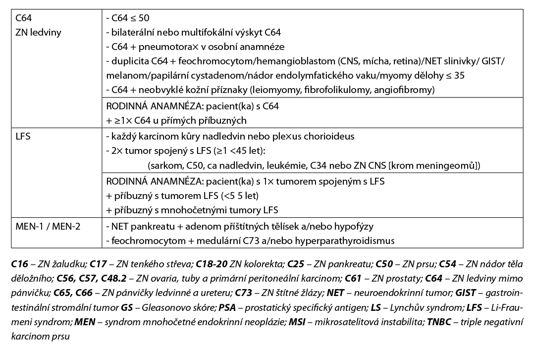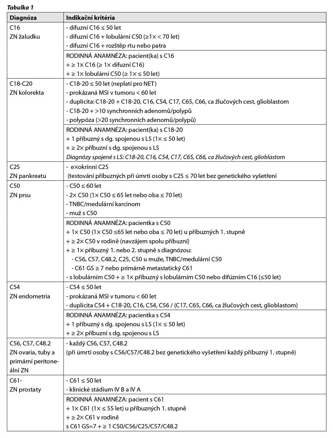 Aktuálně jsou pro nejčastější ZN dospělého věku platná indikační kritéria pro komplexní genetické vyšetření schválená výborem SLG ČLS JEP dne 9. 10. 2024 (Tabulka 1). V případě dalších ZN dospělého věku neuvedených v Tabulce 1 je možno je dohledat v knize Hereditární nádorová onemocnění v klinické praxi (Foretová, 2022), případně je vhodné uvážit možnost genetické konzultace v případě neobvykle nízkého věku vzniku ZN nebo nápadně vysoké přítomnosti ZN v rodinné anamnéze u biologicky příbuzných osob.