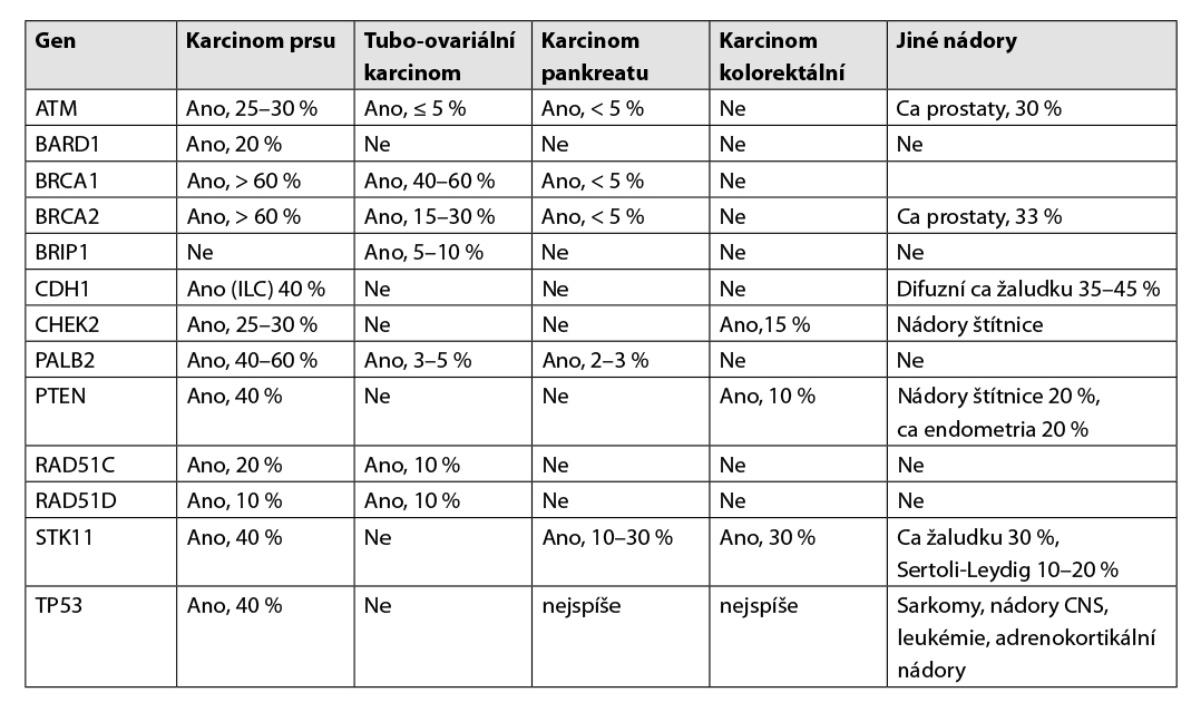 Hereditární syndrom nádorů prsu a ovarií je definován na základě výskytu vícečetných malignit – nádorů prsu a ovarií v rodině a molekulárně je definován identifikací germinální patogenní mutace v určitých genech – viz tabulka č. 1.
