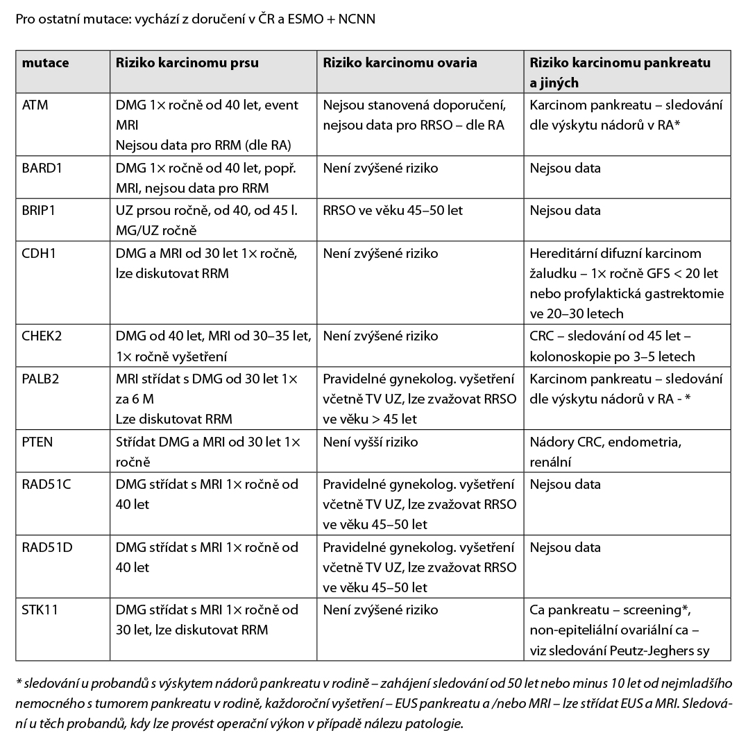 V roce 2024 byla v časopise Klinická onkologie vydána doporučení pro nejčastěji postižené geny predisponující ke vzniku dědičného karcinomu prsu, ovaria a kolorekta – BRCA1, BRCA2, PALB2, ATM a CHEK2; /files/klinicka-onkologie/535/6356.pdf a MLH1, MSH2/EPCAM, MSH6 a PMS2: /files/klinicka-onkologie/537/6379.pdf . Doporučené postupy péče pro jednotlivé uvedené nádorové predispoziční geny jsou dostupné ke stažení na webové stránce pracovní skupiny onkogenetiky SLG ČLS JEP v sekci doporučení: https://www.onkogenetika.cz/doporuceni.html.