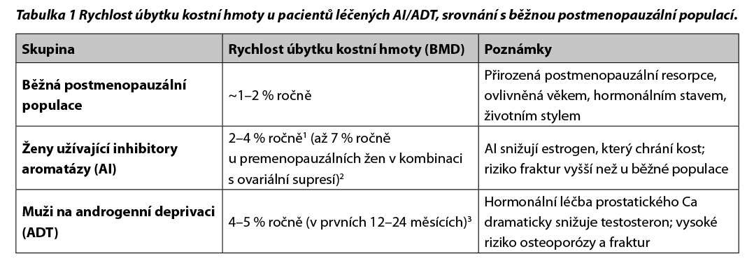 Osteoporóza je chronické metabolické onemocnění skeletu charakterizované úbytkem minerálové kostní hustoty a zhoršenou mikroarchitektonikou kostní tkáně. Klinickou manifestací jsou nízkoenergetické fraktury a/nebo kompresivní vertebrální zlomeniny, typicky bez známek traumatu. Klinickými projevy vertebrálních zlomenin jsou bolesti zad, snížení tělesné výšky, vznik kyfoskoliózy a omezení hybnosti. Celkovým dopadem osteoporózy je chronický algický syndrom, snížená mobilita a soběstačnost, zhoršená kvalita života a ve svém důsledku má osteoporóza značný socio-ekonomický dopad. Osteoporóza je typickým onemocněním vyššího věku, častější u štíhlých žen, ale existuje celá řada onemocnění, které zvyšují riziko vzniku osteoporózy, urychlují progresi kostní resorpce a posouvají klinickou manifestaci osteoporózy do mladšího věku. Onkologická onemocnění a některá léčiva používaná v onkologii patří mezi ně. Zvýšenou bdělost pro rozvoj osteoporózy je třeba mít u všech onkologicky nemocných, ale rutinní management rizika osteoporózy se týká zejména 2 klinických situací: 1/ ženy (příp. muži) s karcinomem prsu užívající inhibitory aromatázy (IA); 2/ muži s androgen deprivační léčbou (ADT). Rychlost úbytku kostní minerální hustoty (BMD) je shrnuta v Tab. 1.