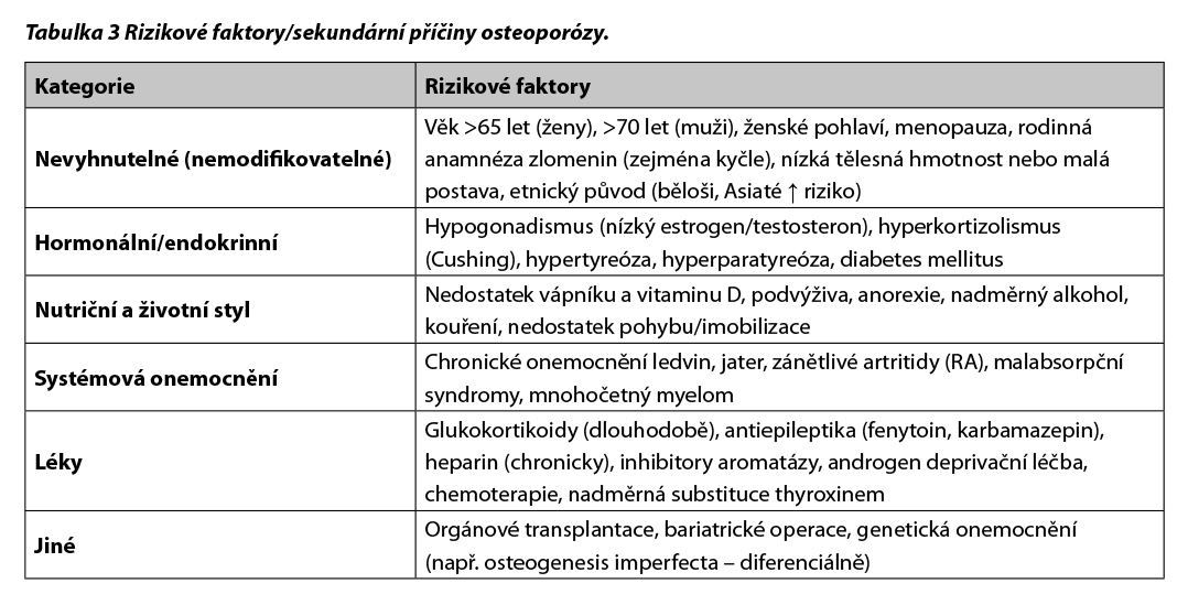 Samotná diagnóza se často stanoví podle T-skóre ≤ −2,5. Druhou možnou diagnostickou cestou je prodělání osteoporotické zlomeniny a to bez ohledu na T-skóre. V případě zlomeniny musí být pro diagnostiku osteoporózy vyloučena jiná (traumatická, onkologická) příčina(Melton et al.). V diferenciální diagnostice kostní nádorové nemoci vs. osteoporózy je nutné v některých případech přistoupit k biopsii. Není-li zjištěna příčina sekundární osteoporózy, jedná se o osteoporózu primární. Přehled nejčastějších příčin sekundární osteoporózy je uveden v Tab. 3.