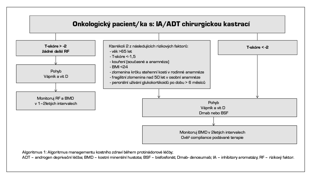 Terapii IA/ADT je třeba brát jako sekundární osteoporózu a je zde nižší práh pro léčbu oproti běžné populaci. Algoritmus sledování a zahájení léčby je uveden v Algoritmu 1 (přeloženo z 4).