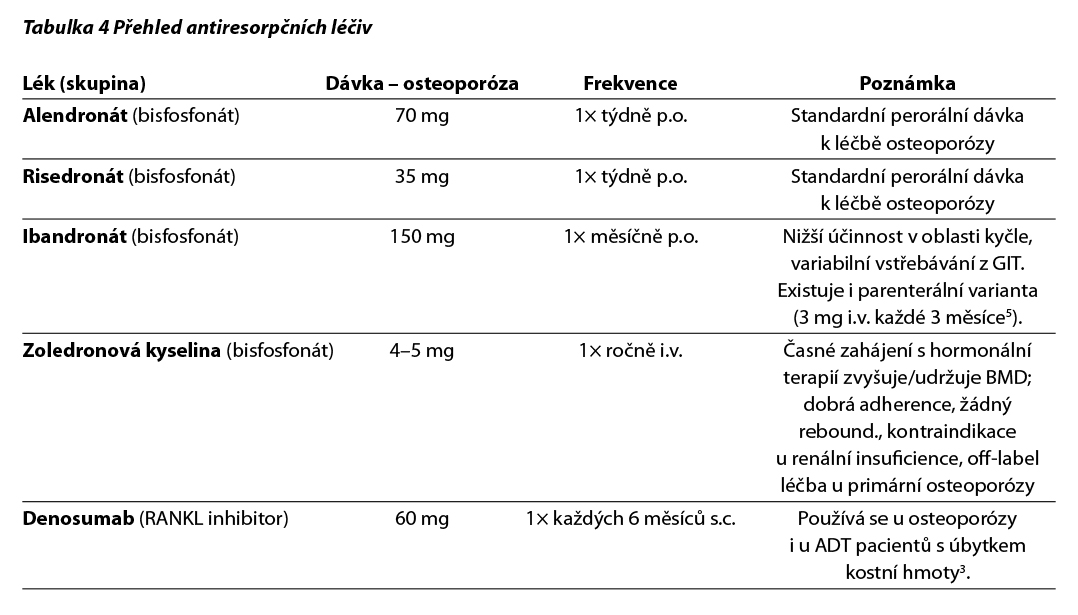 Pro iniciaci zahájení antiresorpční léčby je klíčová správná stratifikace rizika zlomeniny a zhodnocení prognózy pacienta s ohledem na základní onemocnění. Osteoporóza je podobně jako např. hypertenze celoživotní onemocnění vyžadující trvalé sledování a mohou se střídat období aktivní léčba a přerušení. Přehled léčiv je uveden v Tab. 4.