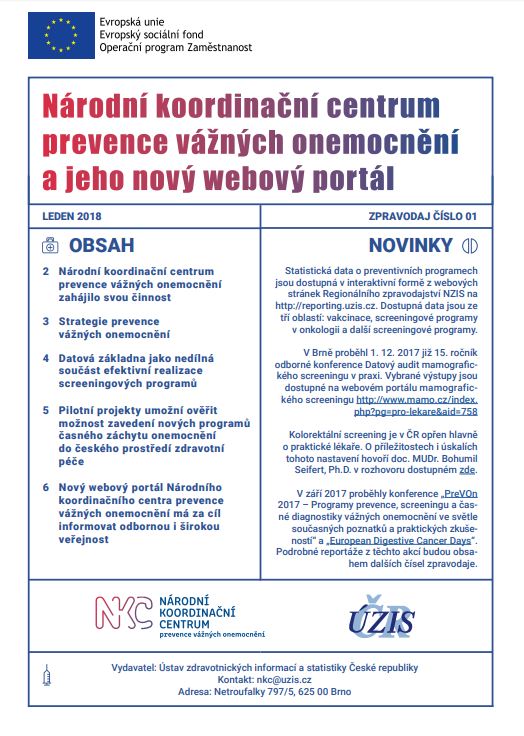 Vychází první číslo zpravodaje, který vydává Národní koordinační centrum prevence vážných onemocnění (NKC). První číslo se věnuje především vzniku NKC, strategii prevence vážných onemocnění, pilotním projektům časného záchytu onemocnění a projektu Datová základna, který slouží k vybudování jednotné a koordinované infrastruktury pro sběr a vyhodnocování dat z probíhajících a nově zaváděných programů časného záchytu onemocnění v České republice.