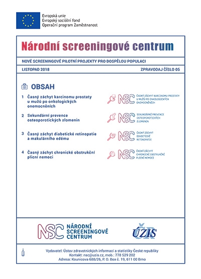 Páté číslo Zpravodaje Národního screeningového centra podrobněji představuje další pilotní projekty realizované Národním screeningovým centrem Ústavu zdravotnických informací a statistiky ČR. Jedná se o projekty zaměřené na dospělou populaci, jeden z nich je zacílen na časný záchyt karcinomu prostaty u mužů, kteří již prodělali onkologické onemocnění.