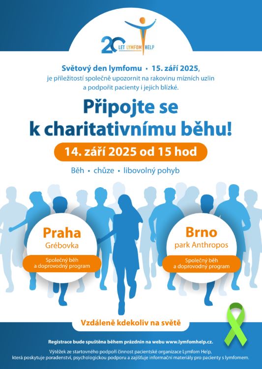 - Přidat do kalendáře: 2025-09-14 14:30:00 2025-09-14 23:59:59 Europe/Prague 20 let Lymfom Help: Připojte se k charitativnímu běhu a podpořte pacienty s lymfomem! Tisková zpráva Lymfom Help, Praha / Brno, září 2025 – Pacientská organizace LYMFOM HELP slaví významné jubileum – 20 let od svého založení. K oslavě tohoto milníku a k podpoře pacientů s maligním lymfomem pořádá historicky první Charitativní běh pro LYMFOM HELP. Akce se uskuteční v neděli 14. září 2025 od 14:30 v Praze a Brně, ale i virtuálně po celém světě, a je otevřena všem, kdo chtějí podpořit dobrou věc. Některá forma lymfomu – zhoubného onemocnění lymfatických buněk, je ročně v ČR diagnostikována u více než 2000 lidí, přičemž několik stovek pacientů se vrací do léčby z důvodu relapsu onemocnění. Praha – park Grébovka, Brno – park Anthropos, virtuálně po celém světě