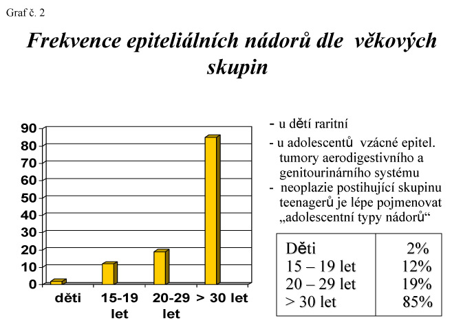 Spektrum nádorů u dospívajících a jejich biologické vlastnosti jsou věkově specifické a významně se liší od spektra nádorů dětí mladších 15 let nebo od nádorů dospělé a starší populace. Epiteliální nádory (karcinomy), typické pro starší věk, tvoří méně než 12% ze všech nádorů u adolescentů. Jejich etiopatogeneze a spektrum patogenetických změn se může s věkem měnit.
