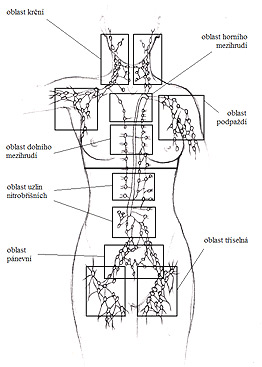 Obr č.1: lymfatické oblasti v lidském těle – zjednodušené schéma.