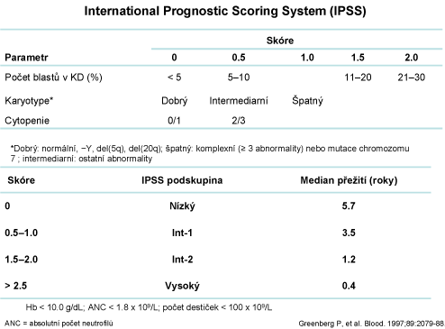 počtu nezralých buněk v kostní dřeni, cytogenetického nálezu chromozomálních aberací a počtu snížení jednotlivých krevních řad viz tabulka1. Celkové skóre IPSS, které pacient dosáhne nám zařadí nemocného do prognostické rizikové skupiny, od níž se poté odvíjí předpoklad délky trvání onemocnění a riziko přechodu do akutní leukémie.