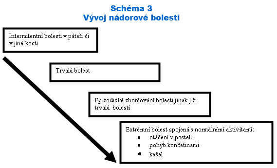 Při klidových a nočních bolestech by praktický lékař neměl váhat s podrobnějším vyšetřením, neboť tyto bolesti mohou být příznakem závažného postižení nádorem nebo zánětem (spondylodiscitida, osteomyelitida). Základem jsou snímky v předozadní a boční projekci. Odlišit uvedené typy postižení je možné dalšími zobrazovacími a laboratorními metodami. Nádorová kostní bolest se typicky vyvíjí dle schématu 3.