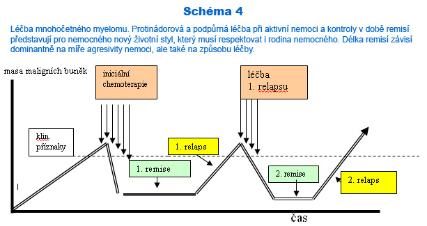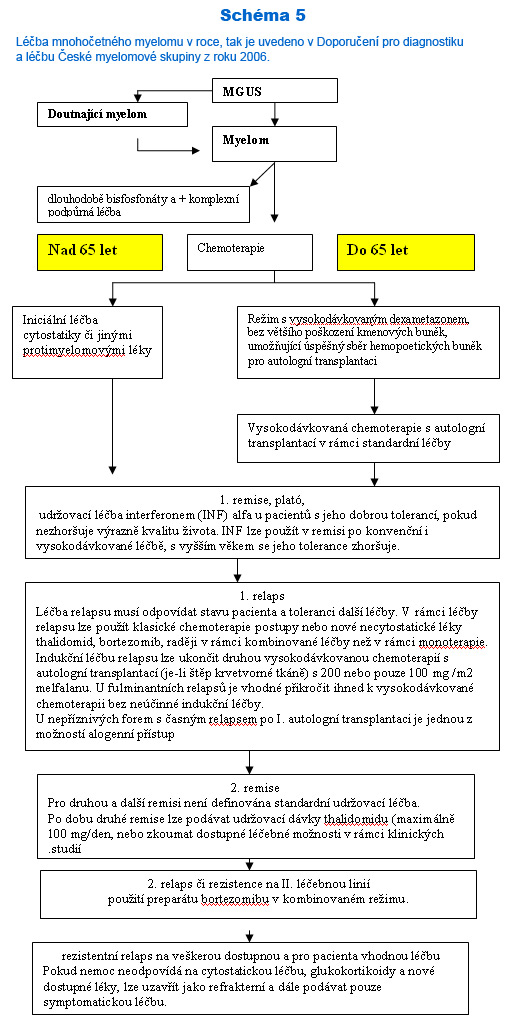 Mnohočetný myelom nelze ve většině případů vyléčit, cílem je dosažení kompletní remise nemoci a pak sledování pacienta. V případě, že nemoc relabuje, obnovuje se léčba s cílem dosažení druhé či další remise. Při použití klasické chemoterapie žije 10 % nemocných déle jak 10 let, při použití vysokodávkované chemoterapie je to až 20 %. Podrobněji tuto léčbu ilustruje schéma 5.