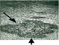 Obrázek 3: Ultrazvukový nález nádoru jater (označen šipkami)