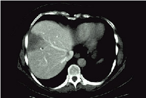 Obrázek 4: Játra v CT obraze, tmavší oválné ložisko vlevo je nádor.