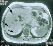 Obrázek 5: Játra s nádorovými ložisky (označenými šipkami) při vyšetření magnetickou rezonancí.