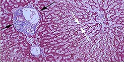 Obrázek 6: Zhoubný nádor jater (označen šipkami) při mikroskopickém vyšetření
