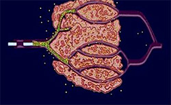 Obrázek 8: Průběh chemoembolizace - do jaterního cévního řečiště se zavede cévka se speciální látkou, která zabraňuje přívodu krve do jater.