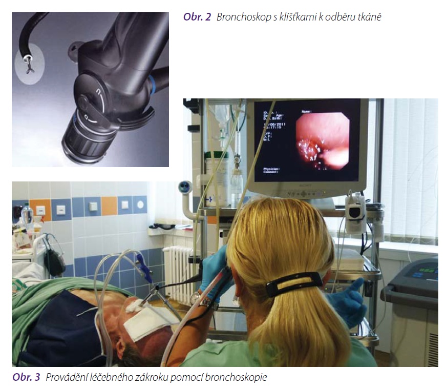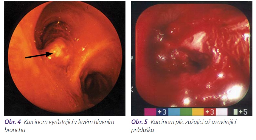 Bronchoskopie (prohlídka dýchacích cest pomocí speciálního přístroje) je základní vyšetření,které ke stanovení morfologické diagnózy užíváme. Toto vyšetření umožňuje odebrání tkáně na histologické vyšetření speciálními kleštěmi, nebo odebrání materiálu k cytologickému hodnocenípomocí speciálního kartáčku, aspirační cévky, výplachem průdušky nebo opakovanými výplachy(bronchoalveolární laváží – BAL). Pohledem lze zhodnotit změny v průduškách, sledovat změny v průběhu nemoci. Při bronchoskopii můžeme provádět i některé léčebné zákroky. Známky nádoruv průduškách mohou být přímé (uvnitř průdušky patrný růst nádoru) nebo nepřímé, podmíněnétlakem nádorové masy nebo zvětšených uzlin na stěnu průdušky. K zisku materiálu z uzlinnebo nádorové tkáně, která naléhá na průdušky zvenčí, užívají některá pracoviště endobronchiální ultrazvuk (EBUS) a k zisku tkáně z periferně uložených nádorů elektromagneticky navigovanou bronchoskopii. Zcela ojediněle se používá autofluorescenční bronchoskopie, která je založena na prohlídce sliznice průdušek po ozáření vlnovou délkou modrého světla, a NBI (NarowBand Imagine), které využívá osvětlení sliznice průdušek úzkým světelným svazkem.
