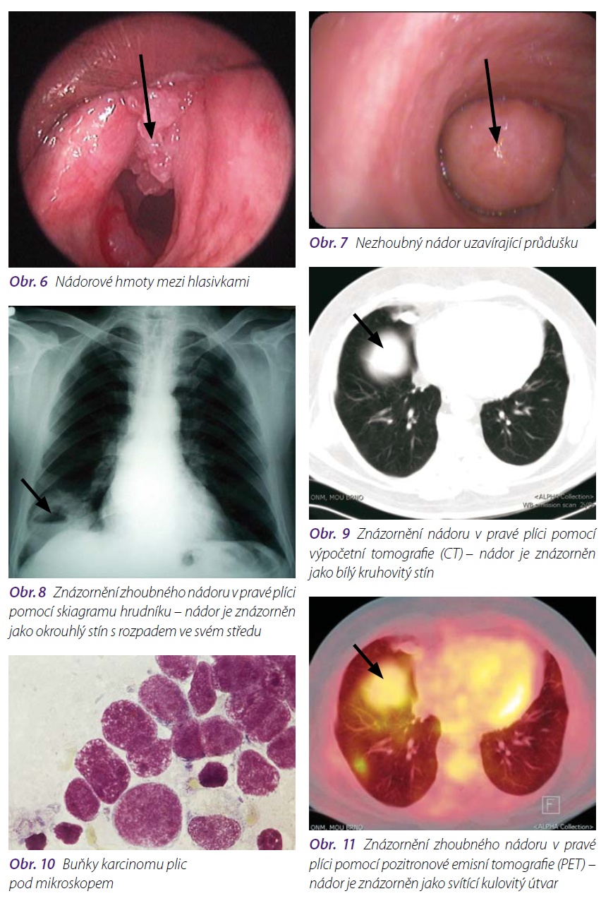 Klinické vyšetření. Prvním krokem, a to nejen u nádorového onemocnění, je objektivní klinické vyšetření nemocného. Poslech na hrudníku u nemocných s karcinomem plic bývá často normální, lékař se však může setkat se všemi obrazy patologického poslechového nálezu (s pískoty a vrzoty, vymizelým dýcháním či zkráceným poklepem). Zapotřebí je i vyšetřit pohmatem lymfatické uzliny a další orgány (především játra a slezinu), jejichž zvětšení může upozornit na šíření nádoru.