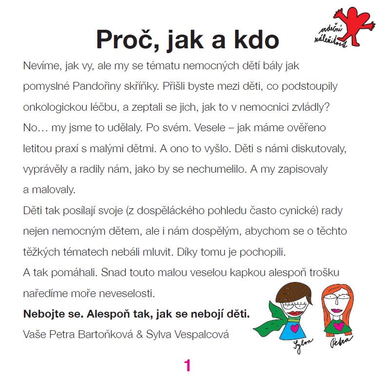 Rady malých onkologických pacientů mohou dospělí vnímat až jako cynické, ale upřímnost, humor a nadhled těchto statečných dětských pacientů otevírá cestu, jak jim porozumět a co pro ně v nelehké situaci udělat. Vše bylo pečlivě zkonzultováno s lékaři Nadačního fondu dětské onkologie PINK BUBBLE.