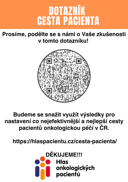 Jedná se o první část velkého výzkumného šetření Hlasu onkologických pacientů, které si klade za cíl zmapovat situaci u nás a na základě Vašich odpovědí pak začít řešit tzv. „šedá“ místa, kde ne všechno funguje úplně tak, jak má. Vyplnění dotazníku nám samotným trvalo nejdéle 30 minut, a i když to není úplně málo, moc Vás prosíme, věnujte tento čas nejen nám, ale i všem onkologickým pacientům! Budeme se snažit využít výsledky pro nastavení co nejefektivnější a nejlepší cesty pacientů onkologickou péčí v ČR.