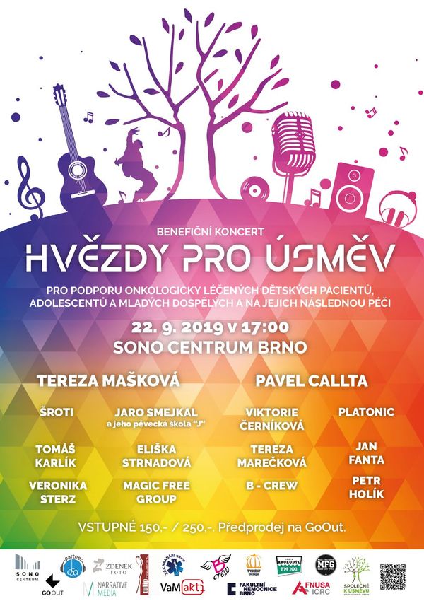Pacientský spolek Společně k úsměvu, který podporuje děti, adolescenty a mladé dospělé během onkologické léčby a věnuje se pozdním následkům, si Vás dovoluje pozvat na druhý ročník benefičního koncertu HVĚZDY PRO ÚSMĚV. Koncert se koná 22.9.2019 od 17:00 v brněnském Sono centru. Výtěžek koncertu bude věnován na podporu onkologicky léčených dětských pacientů, adolescentů a mladých dospělých a na jejich následnou péči.