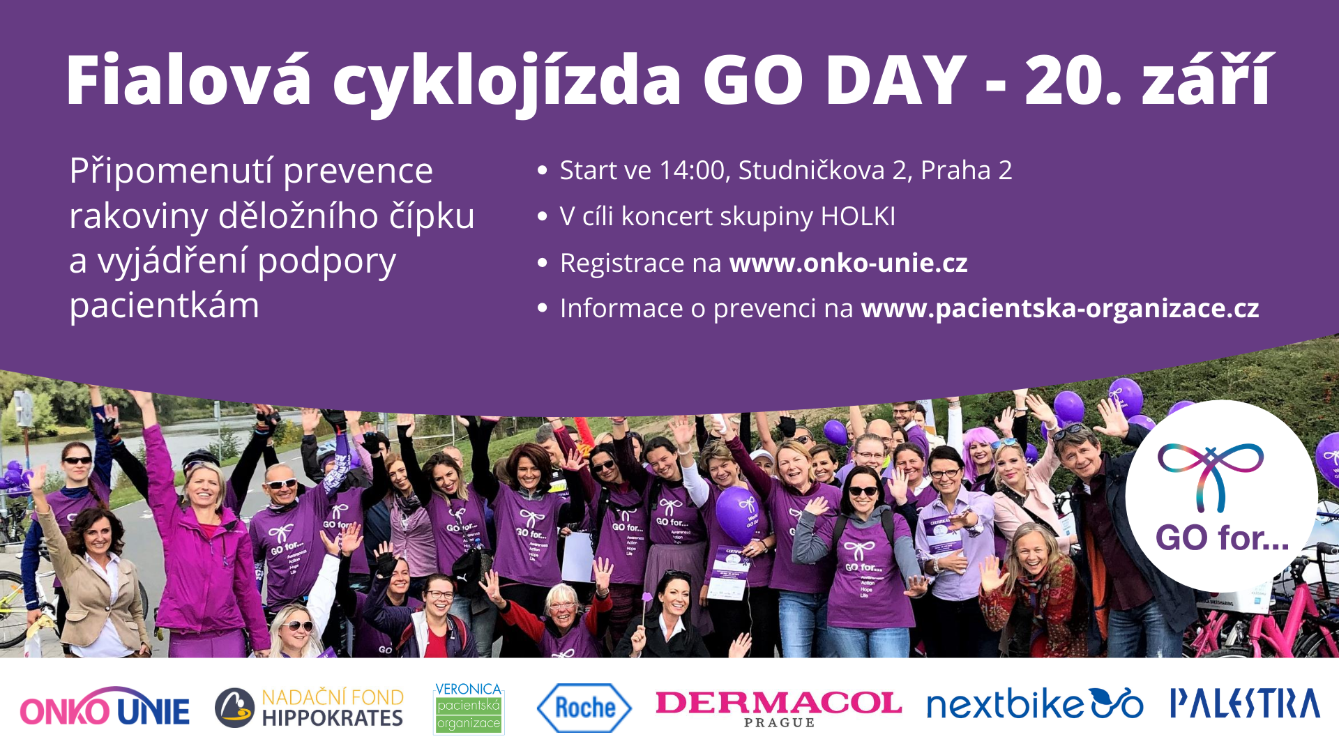 Akce GO Day upozorňující na prevenci onkogynekolgických onemocnění, se uskuteční jako každý rok ve 22 zemích světa. Mezi ně patří i ČR, kde letos GO Day proběhne v Praze, v neděli 20. září 2020. Na cyklojízdu hlavním městem zakončenou koncertem skupiny Holki se vydají lékaři, pacienti, známé osobnosti, novináři i široká veřejnost. Společně tak poukáží na důležitost prevence a vyjádří solidaritu ženám, které s onkologickým onemocněním bojují. Pražský GO DAY 2020 se již podruhé v řadě zaměří na prevenci rakoviny děložního čípku, kterou v ČR ročně onemocní asi 800 žen. Zbytečně, tomuto nádoru je totiž možné téměř vždy předejít – a to kombinací pravidelných gynekologických vyšetření, vakcinace proti HPV u dívek a chlapců a provedením HPV DNA testu namísto klasické cytologie.