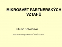 Tématem 9. psychoonkologického sympózia byly onkologické mikrosvěty. Mgr. Kalvodová představila mikrosvět partnerských vztahů v rodině s onkologicky nemocným. Předmětem přednášky je porovnání prožívání pacienta a podpůrné osoby v různých situacích a fázích nemoci. Podpůrná osoba prochází totiž stejnými psychickými reakcemi v průběhu léčby jako sám pacient.